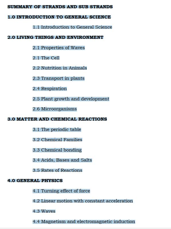 SUMMARY OF STRANDS AND SUB STRANDS